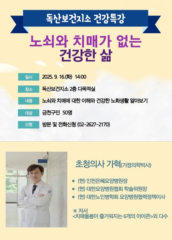 16일에는 구민들을 대상으로 전문가 초청 건강특강이 진행된다. 인천은혜요양병원 가혁 병원장님이 “노쇠와 치매가 없는 건강한 삶” 주제로 강연하며, 노쇠에 치매에 대한 이해와 건강한 노화 생활을 알아보는 시간을 갖는다.