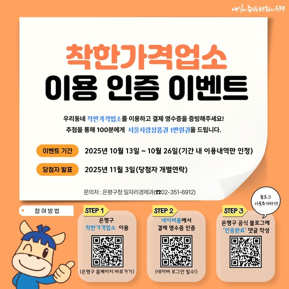 착한가격업소는 물가 안정을 위해 합리적인 가격과 양질의 서비스를 제공하는 업소다. 은평구는 이번 이벤트를 통해 주민들이 더욱 많이 이용할 수 있도록 참여형 이벤트를 마련했다.