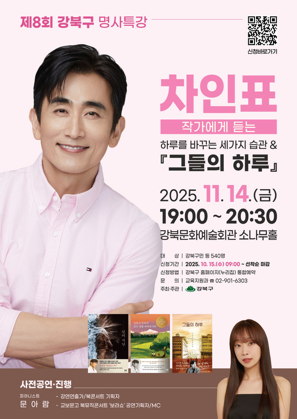 이순희 강북구청장은 “차인표 작가의 강연을 통해 구민 여러분이 삶의 의미를 돌아보고 서로에게 건네는 작은 위로의 가치를 되새기는 시간이 되기를 바란다”며 “앞으로도 다양한 분야의 명사들과 함께하는 배움과 소통의 자리를 꾸준히 이어가겠다”고 말했다.