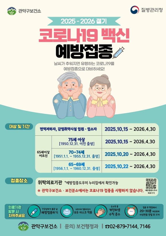 서울 관악구(구청장 박준희)가 호흡기 질환이 증가하는 동절기 대비, 코로나19 감염 고위험군을 대상으로 코로나19 백신 무료 접종을 실시한다.