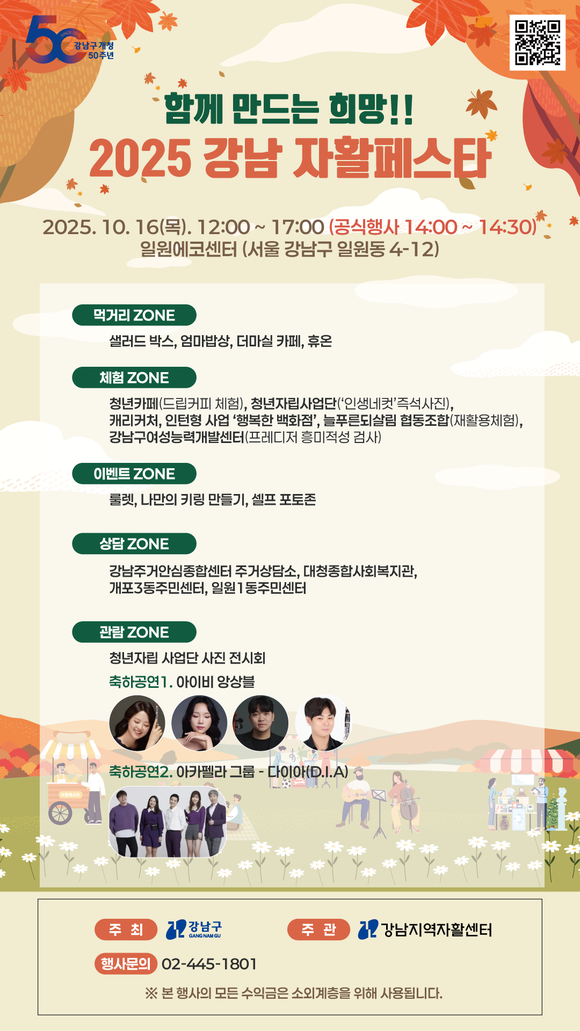 서울 강남구(구청장 조성명)가 10월 16일 낮 12시부터 오후 5시까지 일원에코센터에서 ‘2025 강남 자활페스타’를 개최한다.