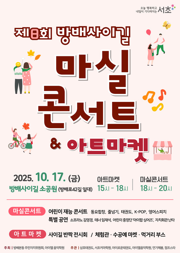 서울 서초구(구청장 전성수)는 오는 17일 방배로42길에 위치한 방배사이길 소공원에서 「제8회 방배사이길 마실콘서트&아트마켓」을 개최한다고 밝혔다.