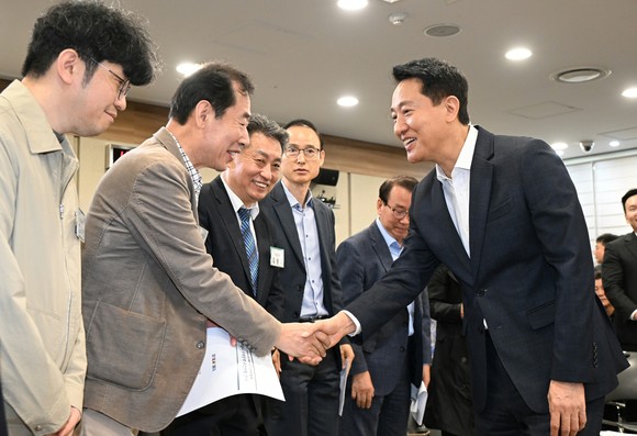 오세훈 서울시장이 16일 서울시청에서 열린 '주택공급 활성화를 위한 민‧관정책협의회'에서 서울시 정비사업연합회 주민대표들과 인사를 나누고 있다. 사진=서울시청