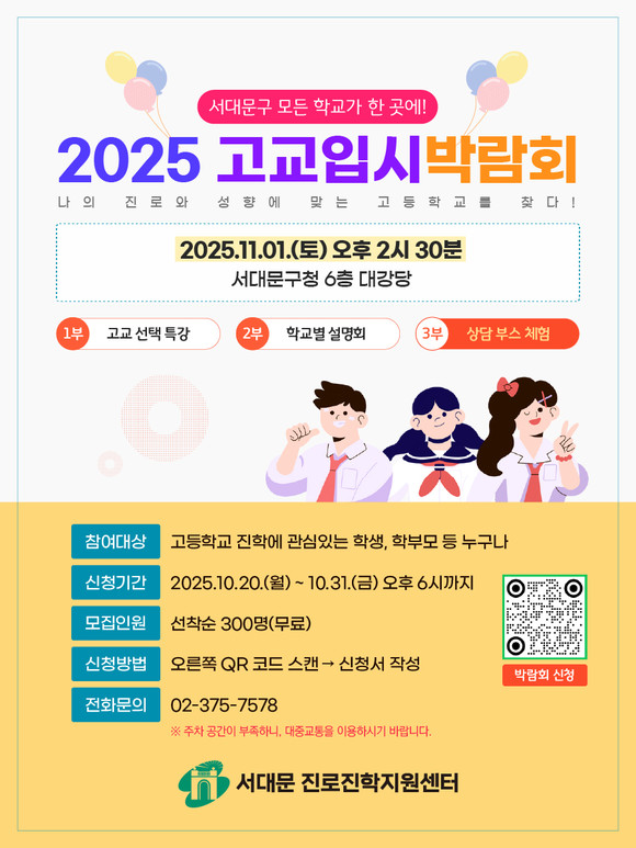서울 서대문구(구청장 이성헌)가 내달 1일 토요일 오후 2시 30분부터 3시간 동안 구청 6층 대강당에서 2025년 고교입시 박람회를 개최한다.