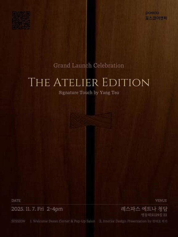 포스코이앤씨(사장 송치영)가 세계적 인테리어 디자이너 양태오 작가와 함께 개발한 하이엔드 인테리어 상품 ‘아틀리에 에디션’을 내달 7일 서울 레스파스 에트나 청담에서 공개한다.