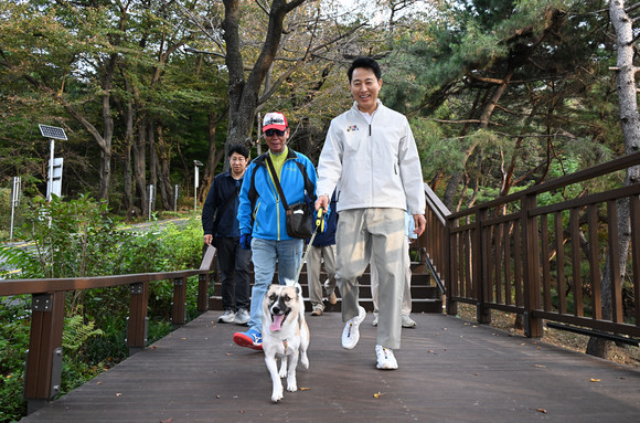 오세훈 서울시장이 26일 아침 7시 30분 도심과 남산을 잇는 무장애산책로 ‘남산 하늘숲길’을 찾아 시민들과 함께 가을 남산을 걸으며 편의와 안전을 꼼꼼하게 확인했다.