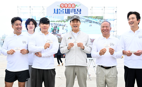 오 시장은 이날 ‘손목닥터9988’ 누적 참여자 250만 명 달성을 축하하고 함께 체력 측정을 하기 위해 참석한 궁금한뇌연구소 장동선 대표, 배우 정준호, 응급의학과 전문의 남궁인, 태재연구재단 김세진 선임연구원, 인플루언서 온오빠, 운동유튜버 핏블리(문석기) 등과 일상에서 당을 줄이자는 의미의 ‘설탕 조형물 깨기’ 퍼포먼스에 참여했다.
