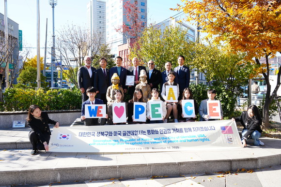 이승로 성북구청장과 아라 나자리안 글렌데일시장은 이날 다소 쌀쌀한 날씨 속에서 평화의 소녀상이 추위에 떨지 않도록 털모자와 목도리를 직접 둘러주며, 양 도시의 우정을 상징하는 의미 있는 순간을 연출했다. 이어 성북구 청소년 대표단은 ‘WE ♥ PEACE’라는 문구가 적힌 피켓을 들고 평화와 인권의 메시지를 전하는 퍼포먼스를 펼쳐 눈길을 끌었다.