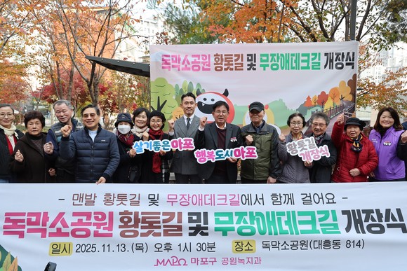 서울 마포구(구청장 박강수)는 이대역 인근 독막소공원(대흥동 814)에 황톳길과 무장애데크길을 조성하고 11월 13일 오후 1시 30분 개장식을 개최했다.