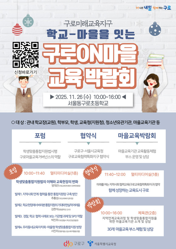 장인홍 구로구청장은 “학교와 마을이 함께 아이들의 성장을 지원하는 것은 지역의 미래를 만드는 일”이라며 “이번 박람회가 구로형 학생맞춤통합지원 모델을 구체화하는 계기가 되길 바란다”고 말했다.