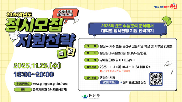 서울 용산구(구청장 박희영)는 2025년 11월 26일(수) 오후 6시부터 8시까지 용산꿈나무종합타운(백범로 329) 꿈나무극장에서 ‘2026학년도 정시모집 지원전략 특강’을 개최한다고 밝혔다.
