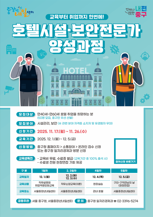 서울 중구가 지역 중장년층의 취업 기회를 확대하고 호텔 산업의 인력수급 안정화를 지원하기 위해 노사발전재단 서울중장년내일센터와 함께 <호텔 시설·보안 전문가 양성과정>을 운영한다.