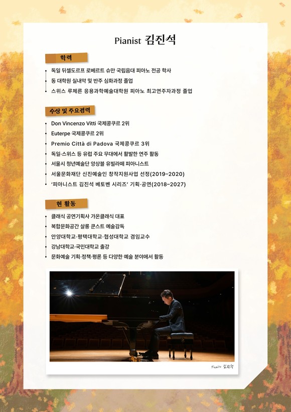 공연은 베토벤의 ‘피아노 소나타 Op.27 1번’을 시작으로, 슈베르트의 ‘3개의 피아노 소품, D.946’과 리스트의 ‘발라드 2번’(S.171)으로 이어진다. 연주와 함께 각 작품에 대한 해설을 함께 들려주며 관객들에게 보다 깊이 있는 음악적 이해를 선사할 계획이다.