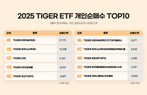 ‘2025년 TIGER 개인 순매수 TOP10 ETF(2025년 1월 1일~11월 21일)’에는 글로벌 대표지수, AI·반도체·전력·로봇 등 신성장 산업, 금현물 테마 등이 포함됐다. 1위는 ‘TIGER 미국S&P500 ETF(360750)’로, 11월 21일 기준 올해 개인 누적 순매수는 2조 7,172억원이었다.