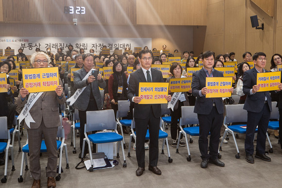 이날 결의대회에 참석한 공인중개사 전원은 ‘부동산 거래질서 확립 자정선언문’을 채택하고, △전세사기 가담·방조 행위 금지 △거래당사자에 대한 투명한 정보 제공 △위험 거래 사전 차단 △법과 원칙에 따른 공정하고 책임감 있는 중개 △불법 중개행위 금지 등의 실천 과제를 선언하며 공정한 거래문화 조성에 적극 나설 것을 다짐했다.