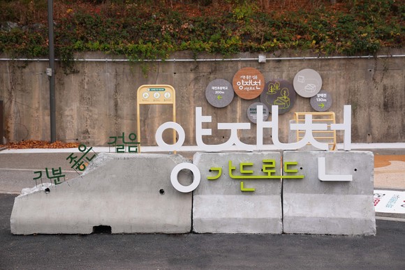 경사로에서 양재천으로 이어지는 보행자 전용 도로는 야간에는 조경등과 도로표지병, 조명 등을 통해 안전하고 감성적인 산책 환경이 조성됐다. 양재천으로 올라가는 데크 계단이 있는 옹벽 일대는 그간 어둡고 삭막한 분위기로 인해 보행자의 발길이 드물었지만, 이번에 로고젝터를 활용한 바닥 미디어 스크린과 펜스에 설치한 바람에 흔들리는 예술 조형물로 밝고 생동감 있는 예술 보행로로 탈바꿈했다. 이와 함께, 보행 시 바닥 압력이 에너지로 변환해 조명이 켜지는 ‘에너지 블록’도 시범 도입돼 친환경 체험 요소를 더했다.