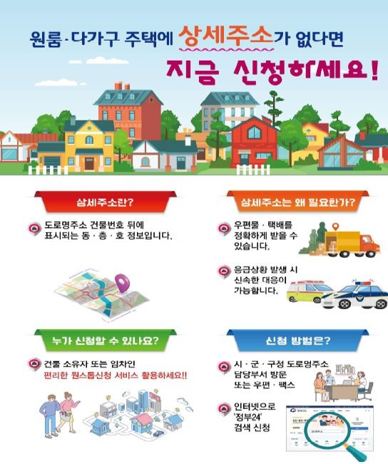상세주소는 등기부등본이나 건축물대장에 동·층·호가 등록되지 않은 단독·다가구주택에 행정기관이 별도의 식별 주소를 부여하는 제도다. 상세주소가 없으면 거주자의 건물 내 위치 확인이 어려워, 응급 구조나 화재 등의 상황에서 골든타임 확보가 힘들고 각종 고지서·우편물이 정확하게 전달되지 못하는 문제가 발생할 수 있다.