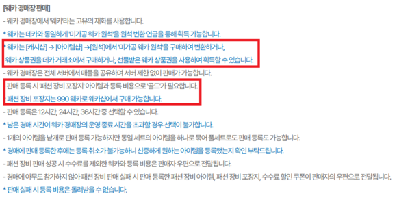 ‘웨카 경매장’ 도입 배경에는 새롭게 공개된 재화 ‘웨카’가 있다. 전설 패션장비를 경매장에 등록하려면 ‘패션장비 포장지’(990 웨카)가 필요하고, 경매 입찰도 웨카만 가능하다.