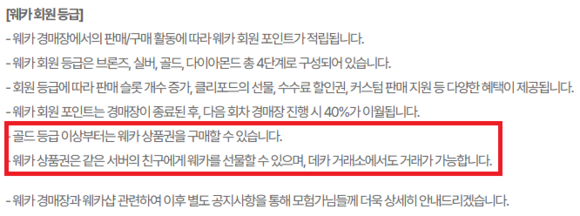 문제는 여기서 끝나지 않는다. 경매장에서 일정 판매·구매 실적을 채워 골드 등급 이상이 되면 ‘웨카 상품권 선물하기’ 기능이 해금되고, 이를 통해 보유한 웨카를 다른 이용자에게 직접 전달할 수 있다.