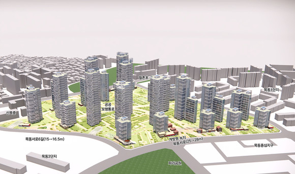 목동 3단지는 기존 15층 1,588가구에서 최고 49층 3,317가구로 변신하며, 저층 주거지와 연계한 1만㎡ 규모의 근린공원이 생기고 기존 어린이집 재건축 등 기반 시설이 보완된다.