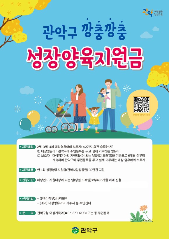 ‘깡충깡충 성장양육지원금’ 지급 대상은 2~4세(2023~2021년 출생) 영유아이며, 관악구에 주민등록을 두고 실제 거주하여야 한다. 보호자는 영유아가 지원 대상 연령이 되는 날(생일 도래일)을 기준으로 6개월 전부터 관악구에 주민등록을 두고 실제 거주하여야 한다.
