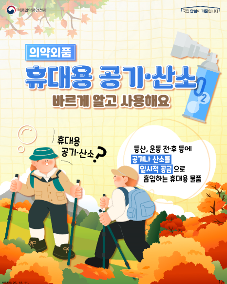 식품의약품안전처(처장 오유경)가 등산, 운동 전후 등에 사용하는 의약외품 ‘휴대용 공기·산소’의 올바른 사용법과 주의사항 등 안전 사용 정보를 안내했다고 11일 밝혔다.