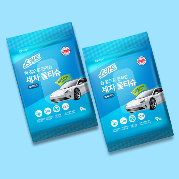 신제품은 차량 내외부에 사용하기 적합한 원단과 세정력을 갖춰, 별도의 물이나 전문 세차용품 없이 주차장 등에서 간단히 세차할 수 있는 제품이다. 극세사 원단을 적용했으며, 기존 가정용 세정티슈 제품 대비 넉넉한 면적으로 설계됐다. 독일 더마테스트 인증 또한 획득했다.