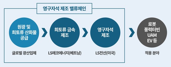 이에 따라 원광·희토류 산화물(글로벌 광산업체)–희토류 금속(베트남·LS에코에너지)–영구자석(미국·LS전선)으로 이어지는 희토류 영구자석 밸류체인 구축이 본격화된다.