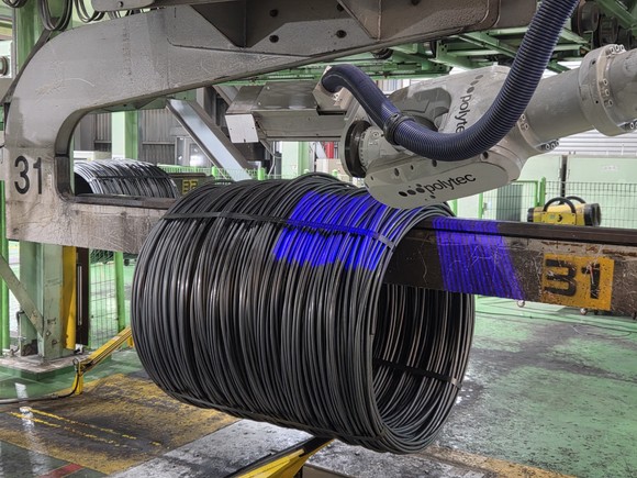 현대제철이 선재(線材) 검사·포장 단계에 로봇을 운용하며 공정 스마트화에 더욱 속도를 내고 있다고 17일 밝혔다. 선재는 가늘고 긴 막대 모양으로 가공한 철강재를 코일 형태로 감아 둔 제품이다.