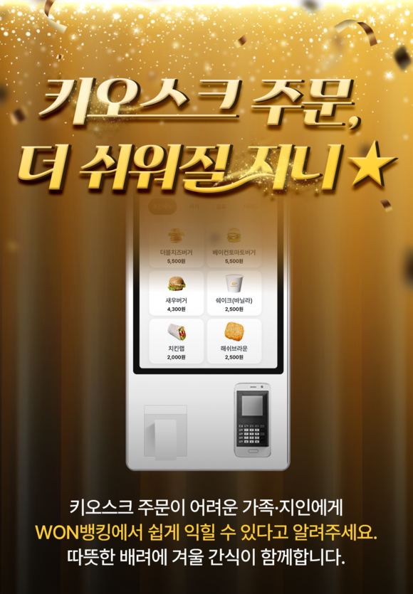 해당 서비스는 ㈜캐어유와의 제휴를 통해 2025년 11월 구축됐으며, 이번 이벤트를 계기로 고객들에게 처음 공개된다. 이용을 원하는 고객은 우리WON뱅킹 앱 내 혜택 메뉴에서 ‘키오스크 주문, 더 쉬워질지니’ 이벤트를 통해 체험할 수 있다.