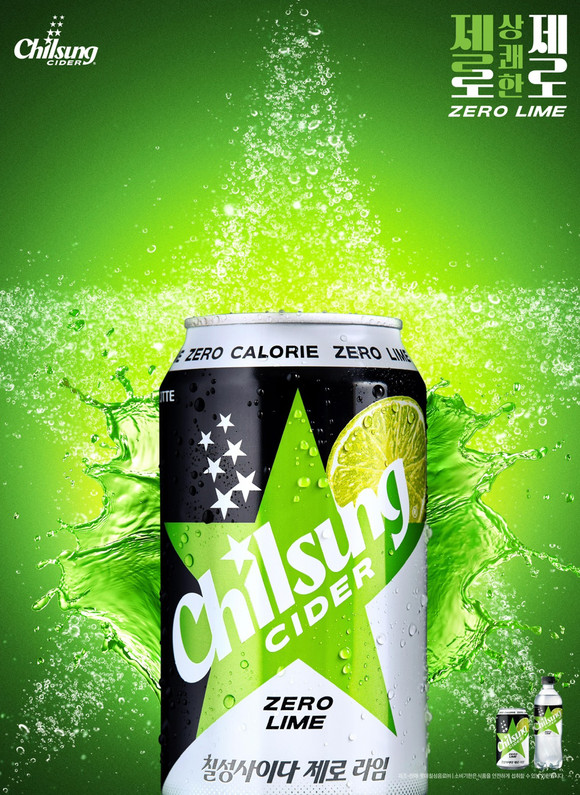 제품 패키지는 칠성사이다 고유 디자인을 유지하면서 라벨 중앙에 연두색 컬러의 별 엠블럼과 라임 이미지를 담았고, 제로 라임이라는 제품 네이밍을 통해 라임향과 시원하고 청량한 제품 속성을 소비자가 보다 직관적으로 인지하도록 표현한 점이 특징이다.