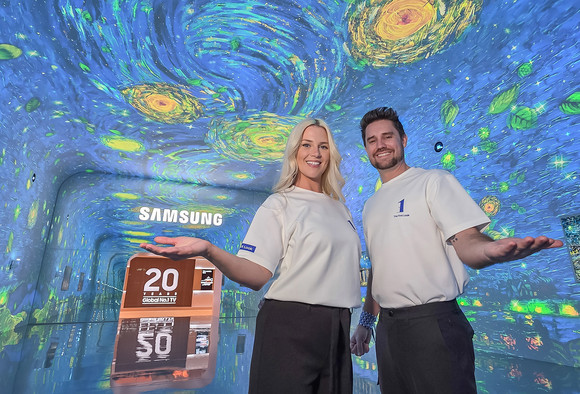 전시관 입구에는 약 20미터 길이의 터널형 디스플레이 ‘AI 갤러리’가 설치됐다. 공간 프로젝션 매핑과 서라운드 사운드를 적용한 이 공간에서는 정선의 ‘인왕제색도’, 반 고흐의 ‘론강의 별이 빛나는 밤’ 등 삼성 아트 스토어 작품을 디지털로 재해석한 영상과 밤하늘에서 도시, 삼성전자 주요 제품으로 이어지는 영상이 상영된다.