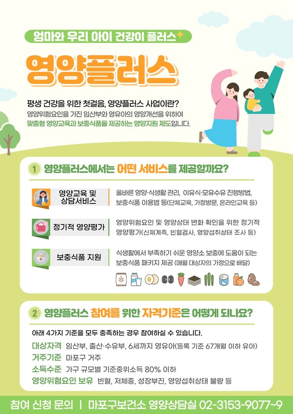 서울 마포구(구청장 박강수)는 임신·출산·수유로 영양 관리가 특히 중요한 임산부와 성장기 영유아의 건강한 식생활을 돕기 위해, 마포구 햇빛센터 ‘영양플러스 사업’ 참여자를 모집한다.