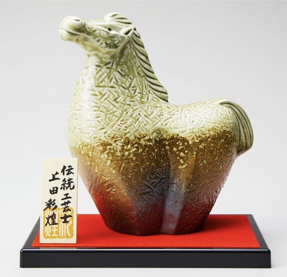 입체적인 도자기 병은 일본의 유명 전통공예사 우에다 사이호(上田 彩煌)가 직접 디자인했으며, 정교한 균열 기법이 적용된 고전적인 미감은 도약하는 말의 형상과 어우러져 생동감을 안겨준다. 제품 하단 붉은색 톤의 받침과 장인의 나무 팻말은 신년의 복을 부르는 장식품으로 가치를 높였다.