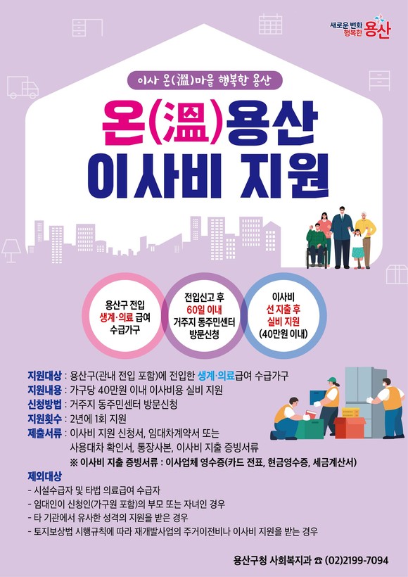 지원 대상은 용산구로 전입(관내 전입 포함)한 국민기초생활보장 생계·의료급여 수급가구로, 이사비를 선지출한 뒤 신청하면 가구당 최대 40만 원 범위 내에서 실제 소요된 이사비용을 지원받을 수 있다.