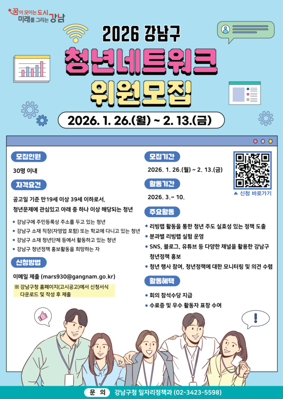 모집 대상은 강남구에 거주하거나 직장·학업 등으로 강남구에서 활동하는 만 19세 이상 39세 이하 청년이며, 모집 인원은 30명 이내다. 구청 홈페이지에서 신청서를 내려받아 작성한 뒤 담당자 전자우편으로 제출하면 된다. 자세한 내용은 홈페이지 공고문을 확인하면 된다.