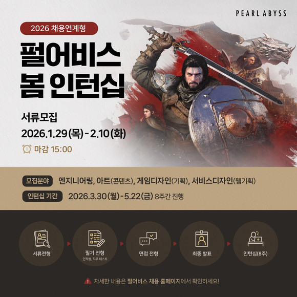 펄어비스가 2026년 채용연계형 봄 인턴십 모집을 29일부터 시작한다고 밝혔다.