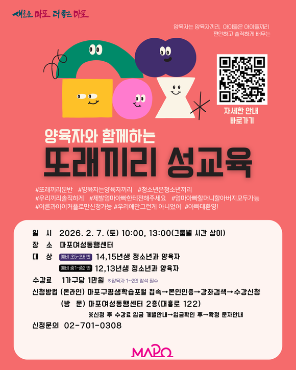 서울 마포구(구청장 박강수)는 부모와 청소년 자녀가 함께 참여하는 ‘양육자와 함께하는 또래끼리 성교육’을 운영한다.