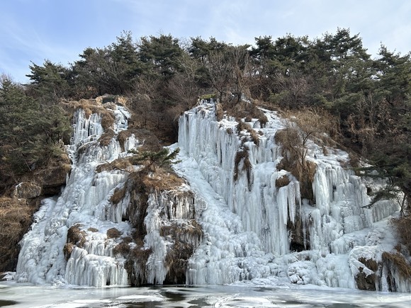 올겨울 홍제폭포는 가로 60m, 세로 25m에 달하는 거대한 은빛 빙벽으로 옷을 갈아입으며 역대급 절경을 선보이고 있다. 사진 속 빙벽은 깎아지른 듯한 암벽을 따라 수천 개의 고드름이 겹겹이 층을 이루며 거대한 얼음 조각품을 연상시킨다. 폭포수가 흐르던 자리를 가득 채운 투명한 얼음 기둥들은 겨울 햇살을 받아 보석처럼 빛나며 보는 이의 탄성을 자아낸다.