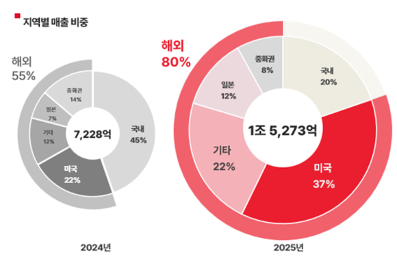 해외 사업 전반에서도 고성장이 이어졌다. 2025년 해외 매출액은 1조 2,258억 원으로 전년 대비 207% 증가했으며, 매출 비중은 55%에서 80%로 크게 확대됐다. 미국과 일본에서 동반 최대 실적을 기록한 데 이어 유럽 등 기타 지역에서도 고른 성과를 거두며 글로벌 전역에서 성장세를 나타냈다.