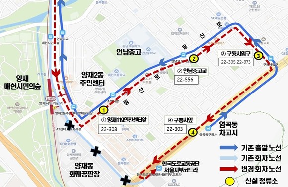 이번 노선조정은 동산로가 편도 위주로 운행돼 발생했던 불편을 개선하기 위한 것으로 동산로를 경유하는 구간에는 양재119안전센터앞(22-308), 언남중고교(22-556), 구룡사입구(22-305·22-973), 구룡사앞(22-303) 등 4개 정류소를 추가해 양방향 운행으로 개선되었다. 이에 따라 동산로를 이용하는 주민들의 대중교통 접근성이 높아지고 우회나 환승 없이 더 직관적인 교통 연결이 이루어질 전망이다.