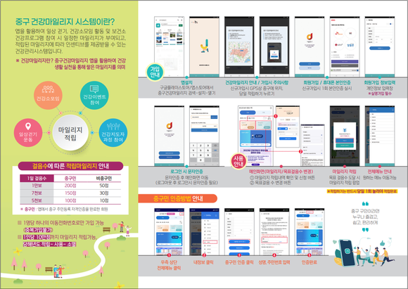 한편 중구건강마일리지 앱을 설치하고 걸으면, 걸음 수에 따라 중구민은 하루 최대 200점, 타지역 거주민은 50점까지 적립 가능하다.