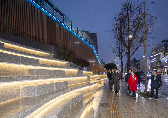 약 8개월간 총 18억 원의 예산을 투입한 이번 정비는 노후화한 시설 개선과 보행 안전 확보에 중점을 뒀다. 녹사평대로40길 55~65 구간에 걸쳐 전망 공간과 툇마루 시설을 확장하고, 계단식 좌석을 도입해 쉼터 기능을 강화했다. 또한 벽천 분수와 경관 조명을 새롭게 설치해 낮과 밤 모두 안전하고 쾌적하게 머물 수 있는 열린 휴식 공간을 조성했다. 이 외에 ▲글자 조형물 ▲바 테이블 ▲원형 탁자 등도 새로 갖췄다.