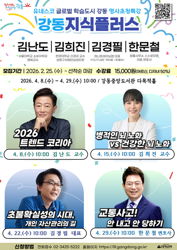 「강동지식플러스」는 매년 상·하반기 운영되는 강동구 대표 명사특강 프로그램이다. 이번 특강은 ‘100세까지 흔들리지 않는 삶의 길잡이’를 주제로 경제·건강·안전 등 각 분야 전문가 4인을 초청해 구민들에게 깊이 있는 지식과 실질적인 정보를 제공할 예정이다.