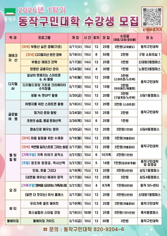 동작구민대학에서는 ▲재테크 자산 ▲디지털·AI ▲글로벌 여행 ▲웰빙 힐링 ▲요리 ▲뷰티 ▲웰에이징 ▲글누리 등 8개 학과, 15개 프로그램을 진행한다.