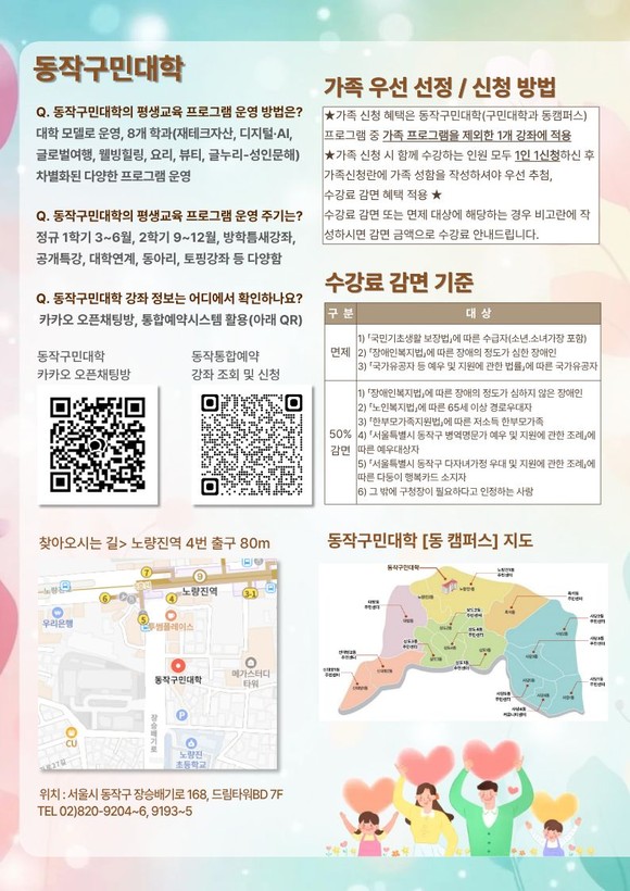 한편, 구민 접근성을 높이기 위해 운영하는 동 캠퍼스(신대방2동, 노량진2동 등 8개 주민센터)에서는 ▲부동산 재테크 전략 ▲생활 속 챗GPT 활용 ▲팝송으로 배우는 영어 ▲미식 클래스 ▲퍼스널컬러 스타일 코칭 등 차별화된 8개 프로그램을 마련했다.