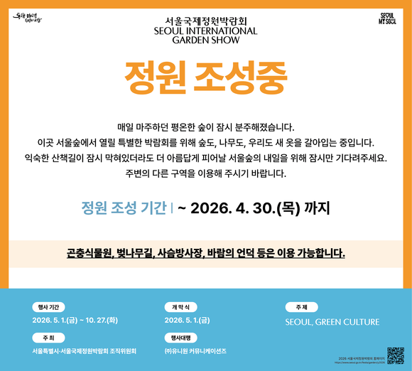 서울시는 2026년 5월 1일 개막하는 ‘서울국제정원박람회’를 앞두고, 서울숲과 성수동 일대에 약 150여 개 정원 조성을 위한 본격적인 준비에 들어갔다. 이에 시설 개선과 공사를 위해 4월 30일까지 일부 구간에 출입이 제한될 예정이다.