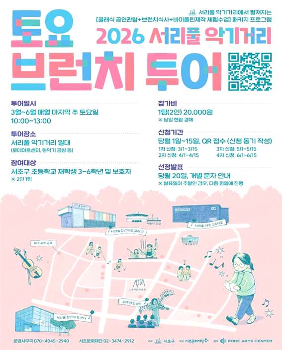 전성수 서초구청장은 “여유로운 토요일 아침, 편안한 문화생활을 일상 속 식사와 함께 즐기는 ‘토요 브런치 투어’를 통해서 아이들과 학부모가 함께 클래식을 자연스럽게 경험하는 계기가 되길 바란다”며 “앞으로도 서리풀 악기거리를 중심으로 공연과 제작 문화가 공존하는 서초만의 문화벨트를 더욱 고도화해 나가겠다”고 말했다.