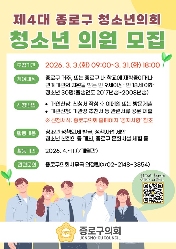 제4대 종로구 청소년의회 운영 및 모집 일정은, 모집인원 ㅇ30명 내 ※30명 초과 시 선착순 선발 ○ 신청자격 : 종로구 거주 또는 종로구 소재 초‧중‧고등학교에 재학 중 이거나 관계기관의 지원을 받고 있는 사람 ○ 활동내용 : 청소년의회 개최 및 의결, 정책의제 발굴, 정책사업 제안, 특별활동(종로구 문화‧시설체험 등)이며 신청기간은 3월 3일(화)부터 3월 31일(화) 18:00까지로 현재 모집 중에 있다.