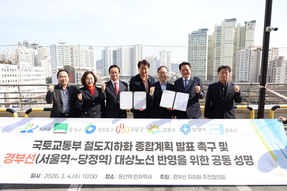 구는 3월 4일 서울 용산역 민자역사 회의실과 역사 내 야외공간에서 열린 ‘경부선 지하화 추진협의회’ 공동성명 발표에 참여해, 경부선 서울역부터 당정역 32㎞ 구간이 철도 지하화 종합계획에 포함돼야 한다는 입장을 밝혔다.